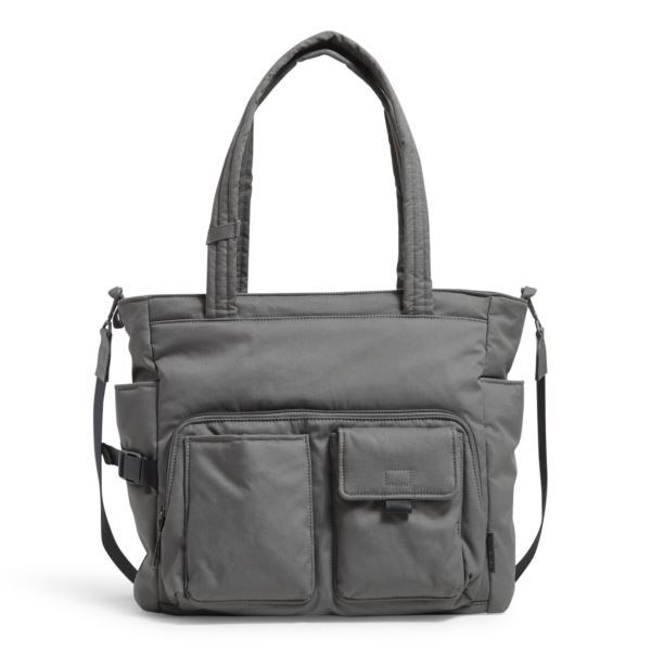 Carry as a tote or wear as a crossbody. Made from Vera Bradley's new Recycled Cotton, the function-focused Utility Collection features an unquilted finish and Vera Bradley's first-ever solid cotton colors! Exterior has a front slip pocket, a front flap pocket, front zip compartment (with 2 slip pockets inside), 2 side slip pockets, and a back slip pocket; interior has a zip pocket; fabric loop on strap; webbing loop on left side of bag; buckle details; zip closure. 14.75"W x 13.5"H x 5"D with an 11" strap drop and 39" removable strap.