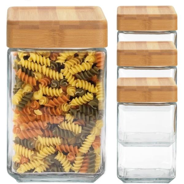 These jars are perfect for use in your kitchen. They feature a flat bamboo top to keep your food safe and for easy stackability. For accessibility, the opening of the jars is wide to easily reach in. The jars are made from clear glass so you can easily see its contents. The glass construction also will not absorb odors or stains. Jars feature a unique square design with rounded edges. Use this in your kitchen to keep your condiments and cooking equipment easily accessible. 4-5/16"L x 4 5/16"W x 7 7/16"H