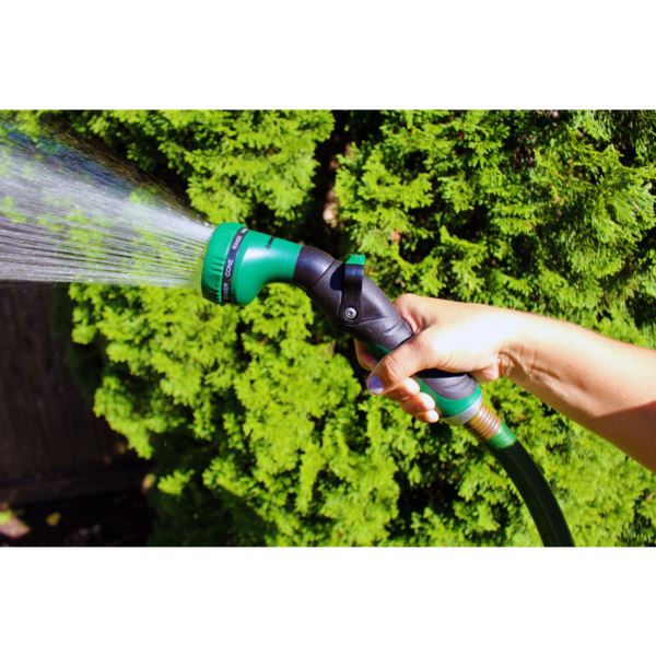 The Thumb Control 9 Pattern Nozzle is easy to use for both water flow control and shut off, there are 9 pattern options: mist, center, stream, vertical, shower, rinse, cone, soaker and flat sprays. This nozzle is constructed of high impact materials that will not rust or corrode and comes with a heavy duty hose attachment.