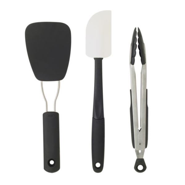 Set includes 9'' Locking Tongs with Nylon Heads. Nylon Flexible Turner and Spatula. Tongs and Turner nylon heads are heat resistant to 400F. Silicone Spatula is heat resistant to 600?F , won't discolor. Dishwasher safe.