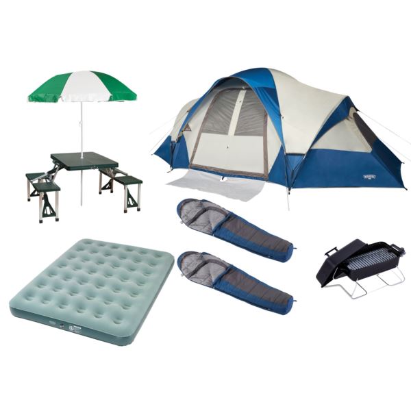 Almost everything you need for a camping trip but the people! Package includes a 10-person tent with removable fly, back to back "D" style doors, E-port plenty of storage and a removable divider curtain and measures 18' x 10' x 76"; a gas table top grill; a portable picnic table with an umbrella; 2 over sized sleeping bags great for 20 - 30 degrees; and a queen size airbed.