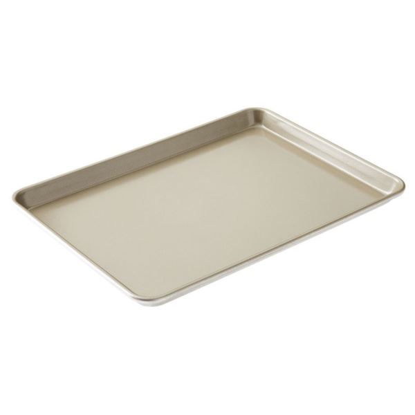 Whether you're creating a sponge cake for a jelly roll, baking vegetables, or a mouth-watering pizza, this pan will be the one you reach for! The edges prevent items from slipping or spilling off when placing in or removing from the oven. Natural aluminum conducts heat evenly and efficiently. Attractive gold-toned premium nonstick coating makes it easy to release baked foods. Edges are reinforced with galvanized steel to prevent warping and rusting for greater durability. Premium nonstick means easy cleanup with hand wash. USA made. 10 year warranty.