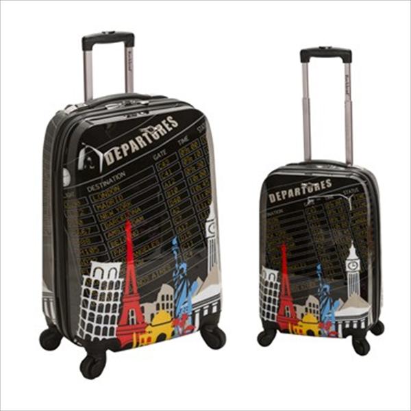 2 pc. hardside set includes a 20" and 28" Upright Sprinner. Spinners have a durable, polycarbonate exterior and feature: lightweight construction; push-button, internal chrome telescoping handle; full interior printed lining with mesh pockets and elastic compartment straps; 4 multi-directional spinner wheels for easy mobility; and a 5-year limited warranty.