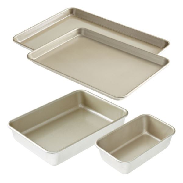 4-piece set delivers consistent performance with incredible release. Set includes one Nonstick Baking Sheet 15"x10.5"x1", one Large Nonstick Jelly Roll Pan 18"x13"x1", one Nonstick Loaf Pan 9.5"x6"x3", and one Nonstick Cake Pan 9"x13". Natural aluminum conducts heat evenly and efficiently. Attractive gold-toned premium nonstick coating makes it easy to remove baked goods. All edges are reinforced with galvanized steel to prevent warping and rusting for greater durability. Premium PFOA-free nonstick means easy cleanup using hand wash. USA made.