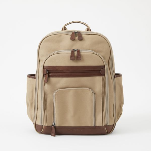 The Edward Backpack features three front zipper pockets, two side pockets, a 15in laptop sleeve and a rear slip pocket that easily converts into a trolley sleeve for travel. Backpack is trimmed in Italian leather and lined with orange polyester. 13" x 4.5" x 17"