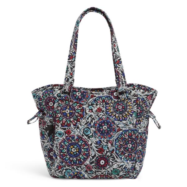 This style is made from Vera Bradley's new Recycled Cotton! Made from 100% cotton, it's everything you know and love about Vera Bradley's go-to fabrication - the softness, the comfort, the vibrancy - now crafted with reclaimed fibers.Exterior has a hidden zip pocket and two slip pockets; interior has multiple slip pockets and a zip pocket; drawstring to adjust the size of the bag; zip closure. 11"W x 12.25"H x 8"D with a 10.5" strap drop.