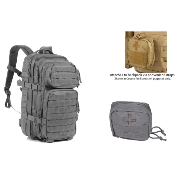 This kit includes a first aid kit that is packed with an assortment of basic medical supplies for minor medical incidents. (zippered case with MOLLE loops; bandage gauze; handsoap; antiseptic wipes; alcohol wipes; aspirin; sterile pad; and tape roll). The first aid kit attaches to the Assault pack that has 28L of storage via convenient straps.
