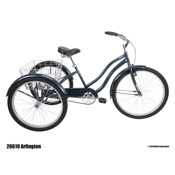 The Arlington Adult Trike features a durable steel frame with a 26" fork; a steel one-piece crank; alloy linear pull and rear coaster brakes; dual density grips and pedals; 14-gauge spokes; wide fenders with bobbed end; alloy quick-release seat binder; a wide "Dual Density" padded saddle with piping; and a basket on the back.