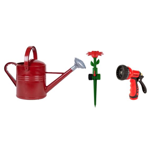 All your watering needs are included! A 1.5 gallon watering can that features and ergonomically double handle design that reduces wrist fatigue while maintaining excellent balancing. A Multi Pattern Aqua Nozzle with 7 patterns and rear trigger design. And a Rotating Flower Spike Sprinkler with shut off that offers gentle watering in a circular spray pattern. Watering diameter is 30 feet with coverage of up to 706 sq. ft.