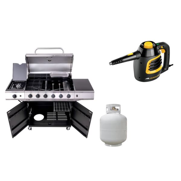 Have the cleanest grill on the block! Package includes: 6 burner cabinet grill that includes a 15,000 BTU sear burner for locking in juices, porcelain-coated cast iron grates that are rust resistant, removable grease pan, cabinet doors and electronic lighter; a 20 lb propane tank and a McCulloch Handheld Steamer that heats up in 3 minutes and has 8 minutes of continuous steam with no pumping and comes with a jet nozzle, triangle brush, large brush, extension hose and nylon utility brush (2 pack).