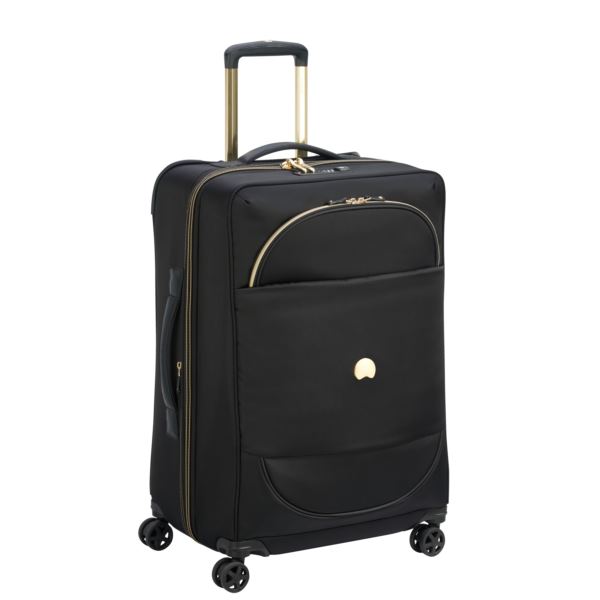 Carry-on luggage has never looked so stylish! The women's bag is equipped with many features including gold metal accents, vegan-leather trim and stylish interior print as well as double spinner wheels and a roomy interior. The interior lining is removable and washable (delicate cycle) for maximum convenience. Your luggage will stay safe and in-tact due the integrated TSA-accepted lock as well as DELSEY patented zip SECURITECH® technology that makes it 3 times stronger than a standard zipper. 27.25" x 16.75" x 11.5", 8.2 lbs.