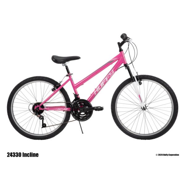 The 24" Incline™ Women's Bike features Huffy Kolo 1200 suspension fork for smoother rides over tough terrain, Huffy Kolo 3-piece crank for added durability, durable hard tail steel frame, 18-speed twist shifting for smooth performance, brushed-finished rim for great friction and better braking and alloy quick-release seat binder. Recommended ages 12+. Some assembly required.