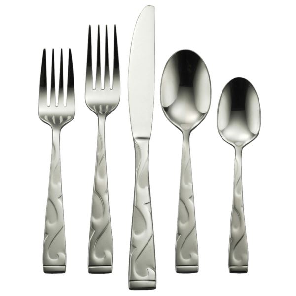 Casual 18/0 Stainless Steel Flatware. Decorative design with two-tone sandblast finish. (4ea) Place Knives, Place Forks. Place Spoons, Salad Forks, Teaspoons. Dishwasher Safe, 25 Year Warranty.