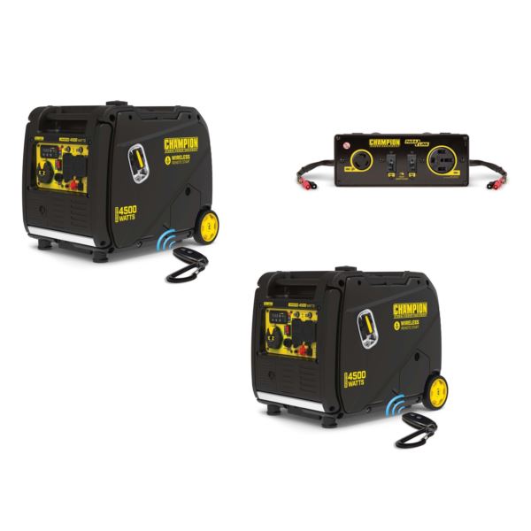 Instantly increase power by connecting the two inverter generators. Each 4500-watt inverter generator with remote key fob allows you to start and stop your generator from up to 80 feet. The 79cc Champion engines with electric start each include a battery. Your power is increased with the Parallel Kit which quickly and easily is installed without tools, this kit includes circuit breakers plus 120V 20A household outlets with clean electricity. Includes 2 covered 120V 20A household outlets with clean electricity and two USB ports,