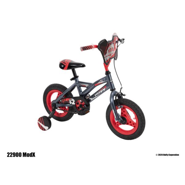 The Mod X has a Triad frame; steel unicrown fork. Features jr. size front handbrake and rear coaster brake; comfortable seat with alloy quick release; durable training wheels to add stability for young riders. Tires are 12" x 1.95" trial edge with die-cut mag rims.