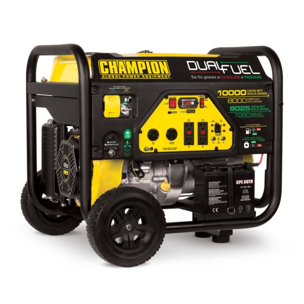 Ultra-powerful 8000-watt generator with electric start features Dual Fuel, allowing the 459cc engine to run on either gasoline or propane. Provides up to 8 hours of run time on gasoline or 5 hours on propane. Features Intelligauge; Cold Start Technology; low oil shut-off sensor; 3.3 foot propane hose with built-in regulator; Volt Guard built-in surge protector; foldaway U-shaped handle; never flat tires; 3-year warranty and free lifetime technical support. Includes oil funnel, wheel kit, engine oil and battery. EPA certified and CARB compliant.